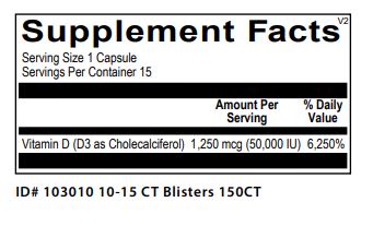 Vitamin D is a steroid hormone that is part of a group of fat-soluble pro-hormones best known for the role they play in supporting bone health and aiding in the absorption of calcium and phosphate from the gastrointestinal tract. A growing body of research highlights vitamin D’s important role in supporting other body systems, including cardiovascular and blood sugar balance, musculoskeletal strength, and neurological and immune function, enabled by vitamin D’s ability to target over 200 different genes throughout the body. At the same time, deficiency and insufficiency of this important nutrient has reached epidemic proportions around the world, making the achievement of optimal levels extremely important to overall health and wellbeing. Vitamin D3 50,000 IU is ideal for those who have difficulty achieving and maintaining peak vitamin D levels.